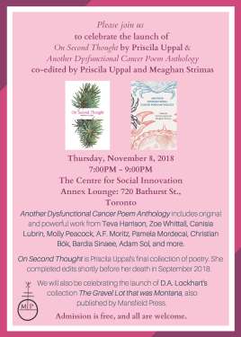 I’m really pleased to have two poems included in Another Dysfunctional Cancer Poem Anthology, edited by Priscila Uppal and Meaghan Strimas. (Priscila recently passed away after a long journey with a very rare form of cancer. I never met her, but I was familiar with her work and aware of her reputation for energy and generosity of spirit. I love her poem, “Good Death.”) The book will have its Toronto launch on Saturday, November 8, with two other Mansfield Press titles, including Priscila’s final poetry collection, On Second Thought. I won’t be in Toronto for the event, but maybe you will?